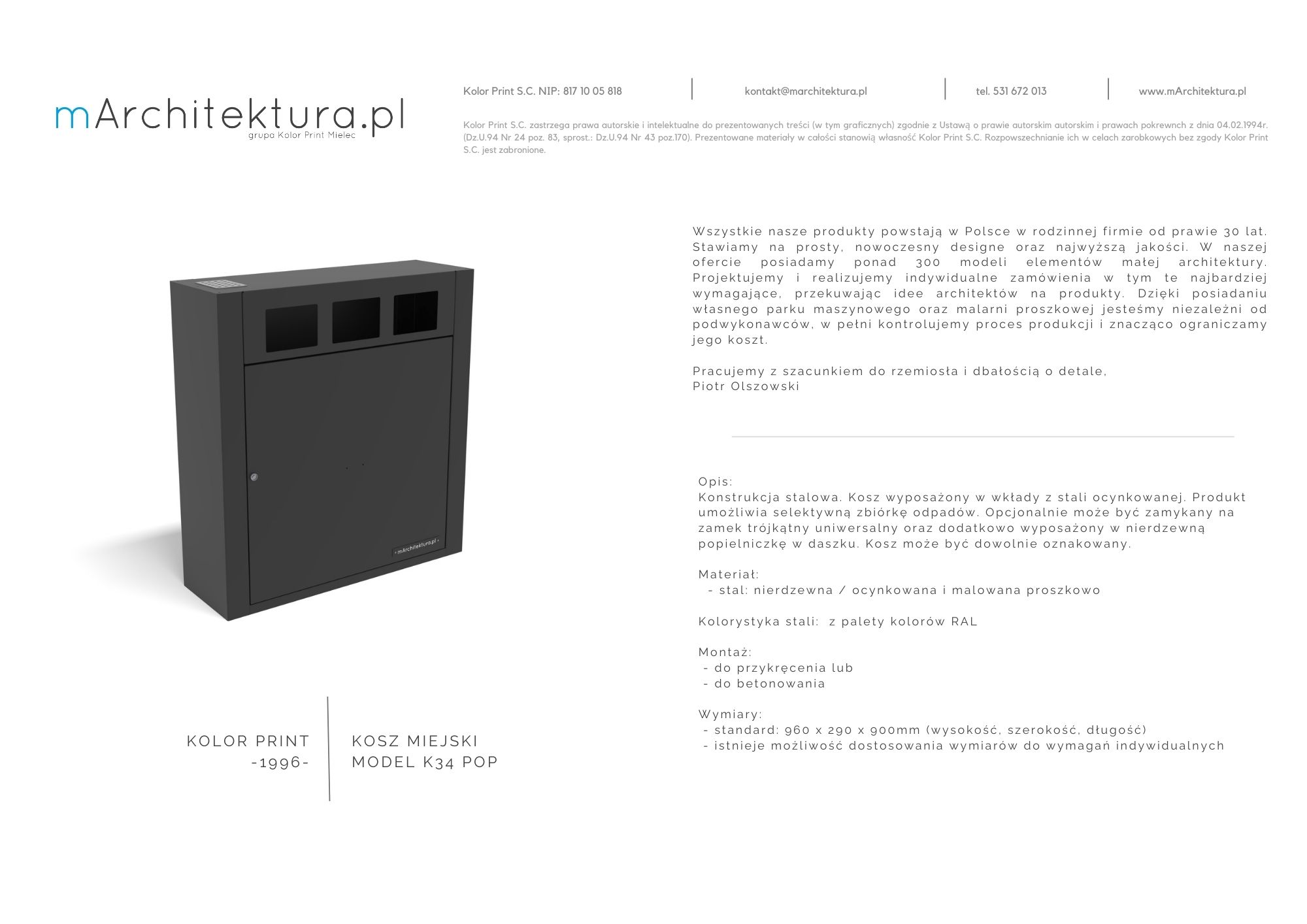 Wszystkie kosze na śmieci produkowane są w naszym zakładzie w Mielcu w rodzinnej firmie od prawie 30 lat. Stawiamy na prosty, nowoczesny designe oraz najwyższą jakość.