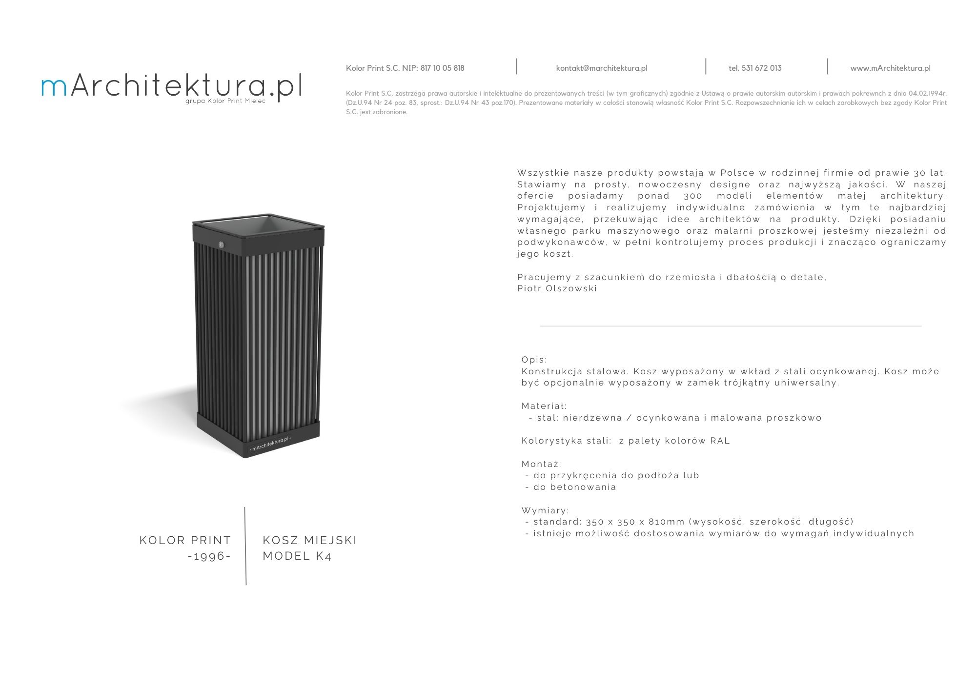 Wszystkie kosze na śmieci produkowane są w naszym zakładzie w Mielcu w rodzinnej firmie od prawie 30 lat. Stawiamy na prosty, nowoczesny designe oraz najwyższą jakość.