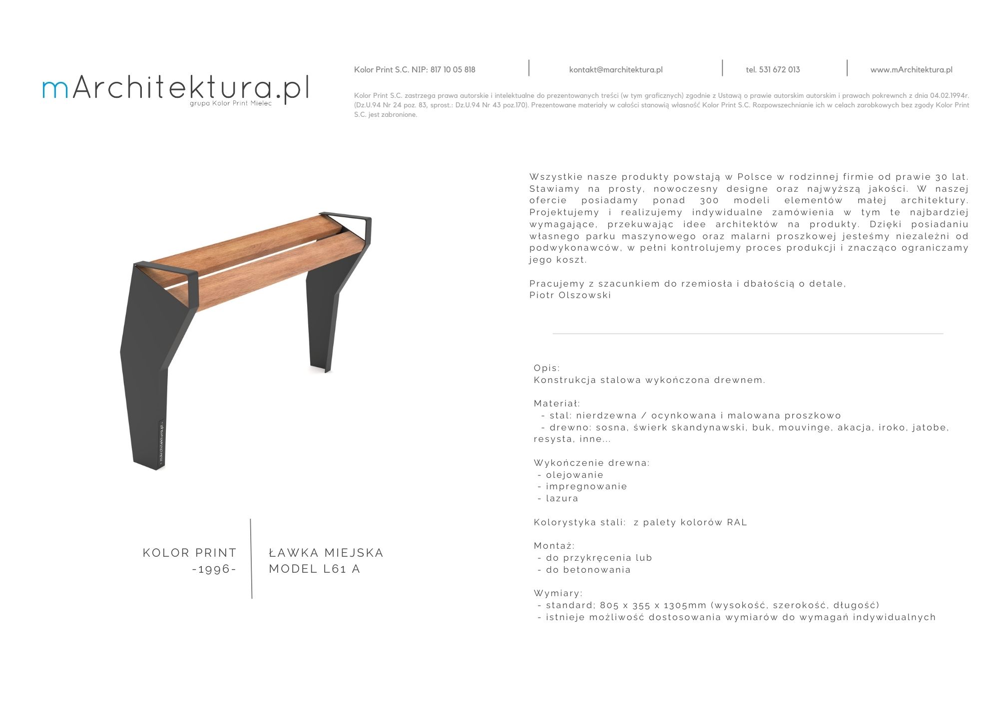 Wszystkie prezentowane na naszej stronie ławki produkowane są przez nas w naszym zakładzie w Mielcu. W rodzinnej firmie od prawie 30 lat. Stawiamy na prosty, nowoczesny designe oraz najwyższą jakość.