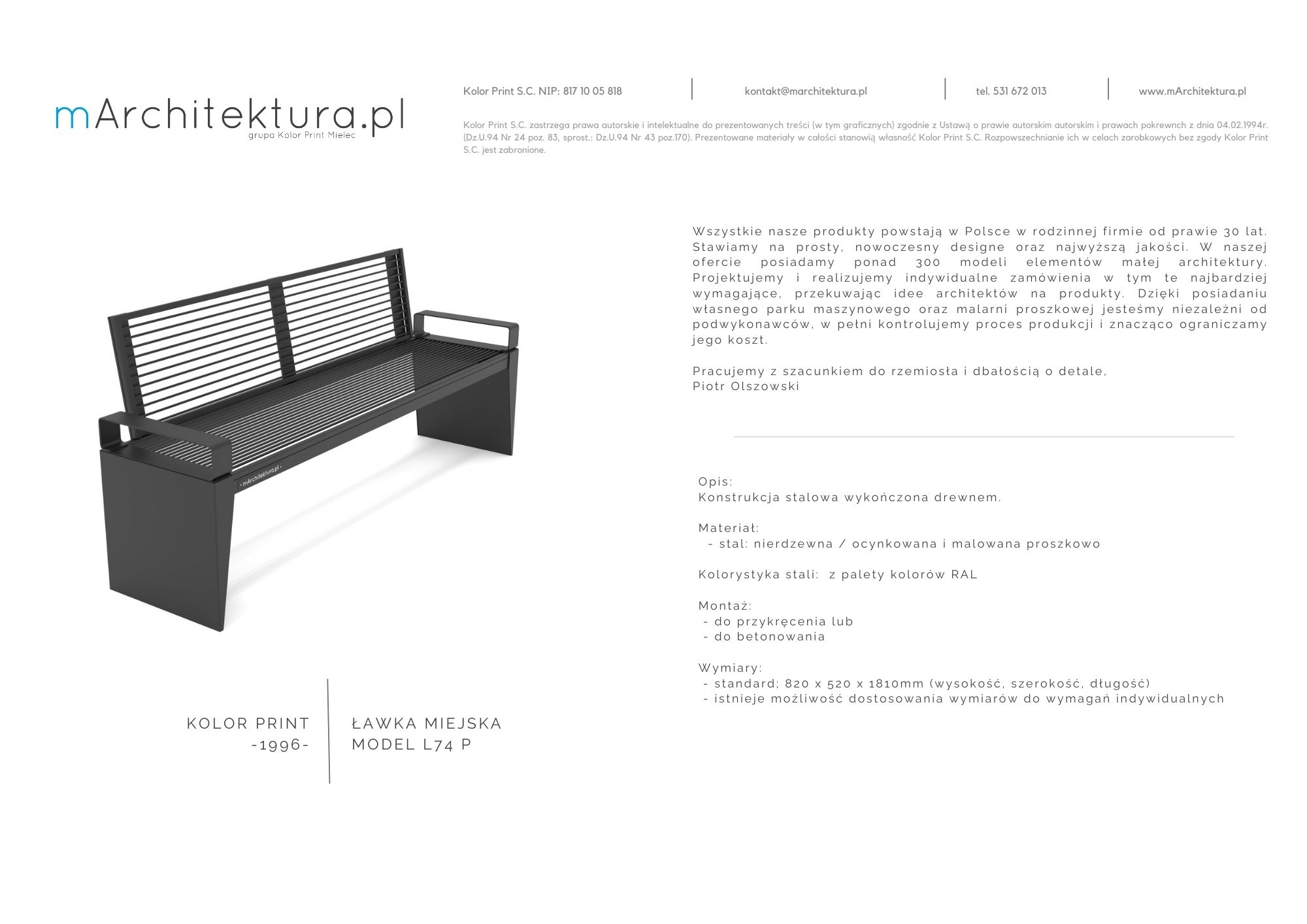 Wszystkie prezentowane na naszej stronie ławki produkowane są przez nas w naszym zakładzie w Mielcu. W rodzinnej firmie od prawie 30 lat. Stawiamy na prosty, nowoczesny designe oraz najwyższą jakość. Ławki produkowane są z dbałością o detale i jakość wykończenia. Istnieje możliwość optymalizacji naszych produktów poprzez dostosowanie wymiarów, wyposażenia, kolorystyki, zastosowanych materiałów oraz sposobu montażu. Jeżeli potrzebujesz więcej informacji zapraszamy do kontaktu.